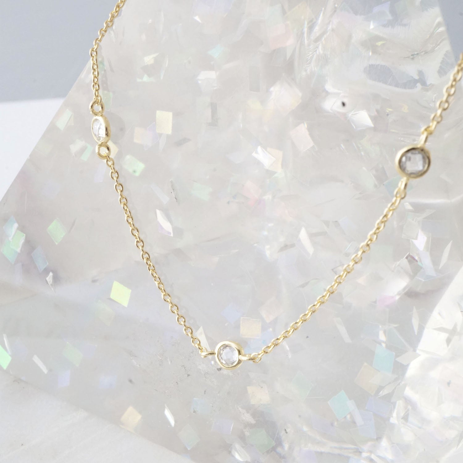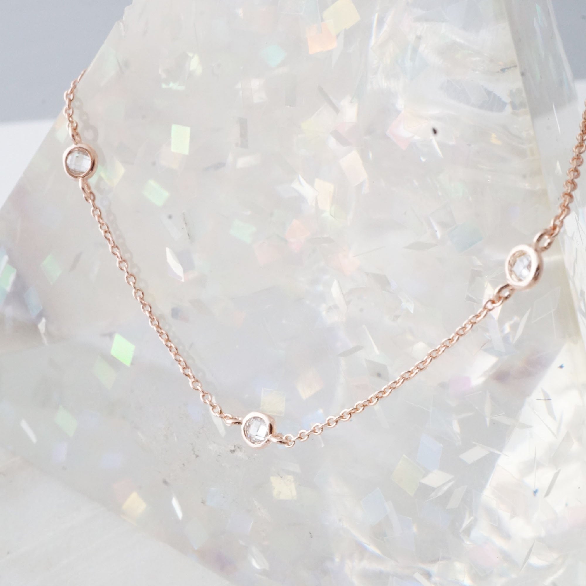 Three tiny single bezeled crystals are at the center of a whisper thin chain. This classic and minimalist style is equally gorgeous when worn solo or layered - the adjustable length makes layering super easy. Wear it full length or as a choker and layered alongside your favorite Honeycat necklaces. Length: adjustable between 14" - 17.5".