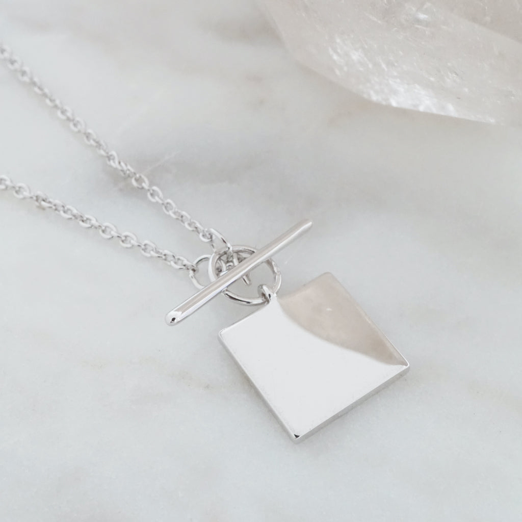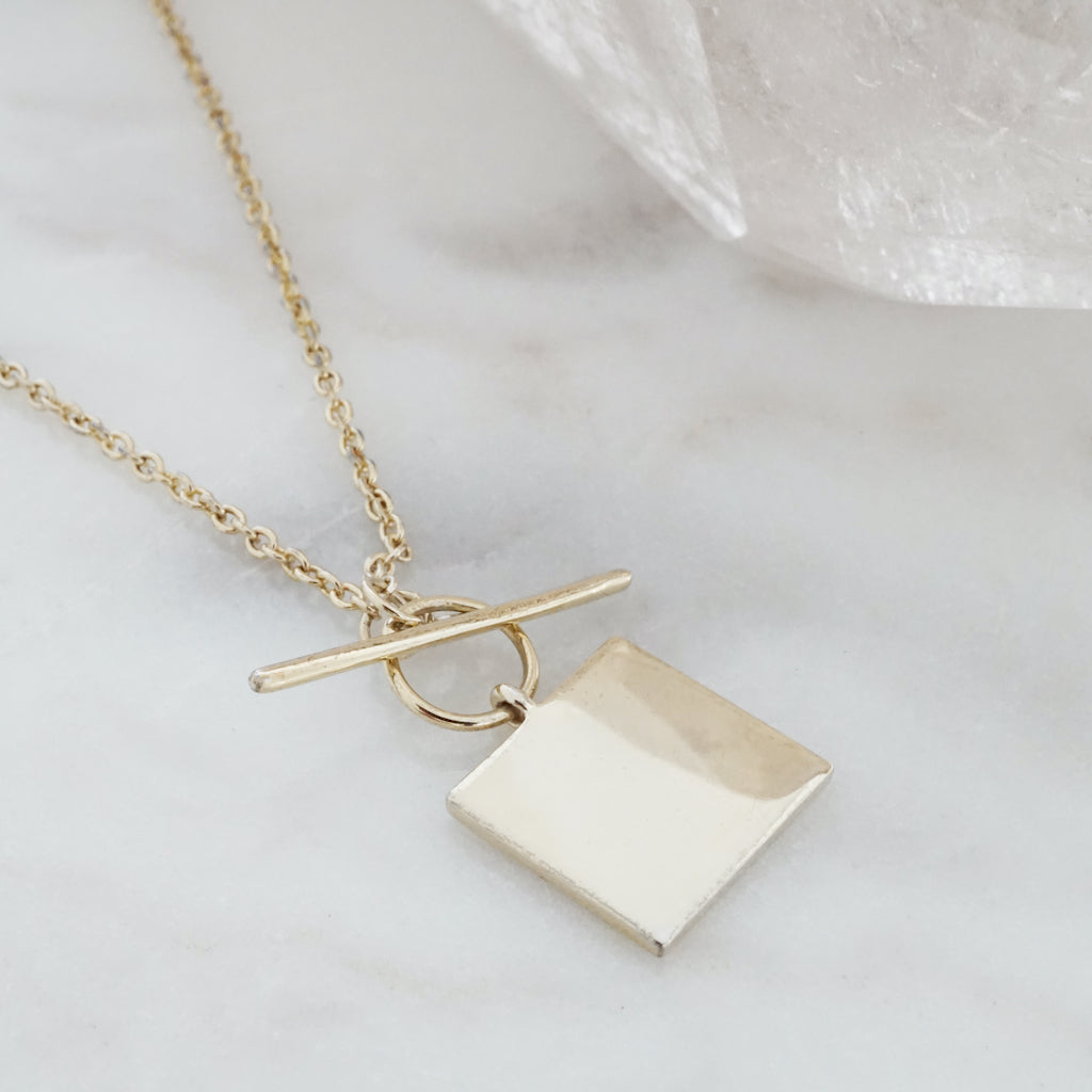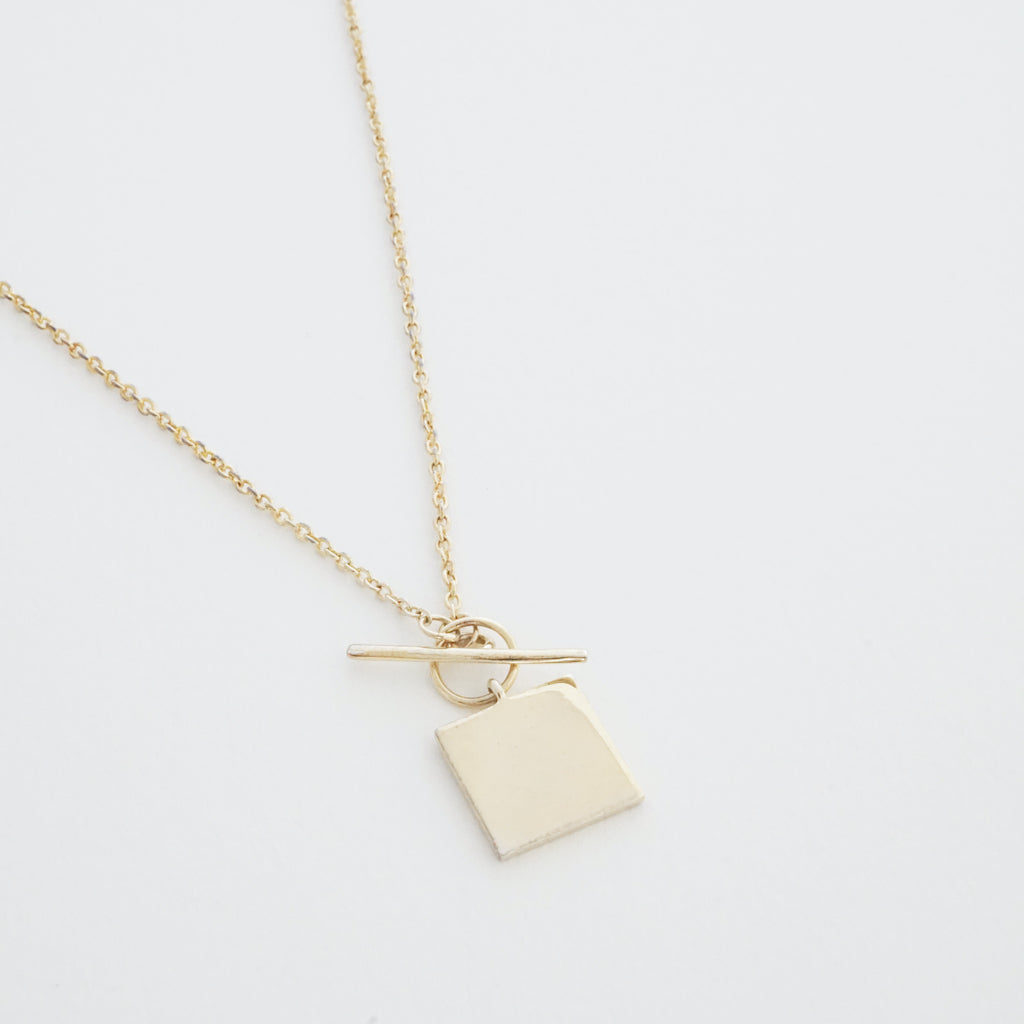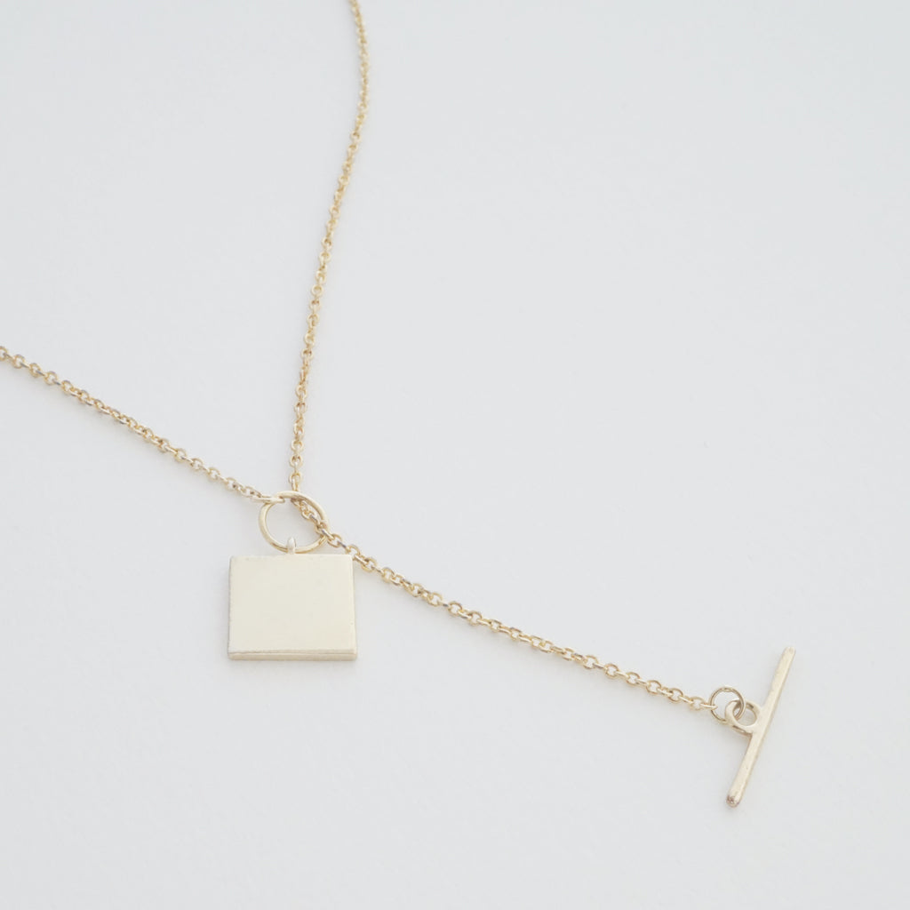 A whisper thin chained necklace featuring a polished toggle and square charm. We love wearing this one by itself as much as we do layered with another of our simple Honeycat chain necklaces.