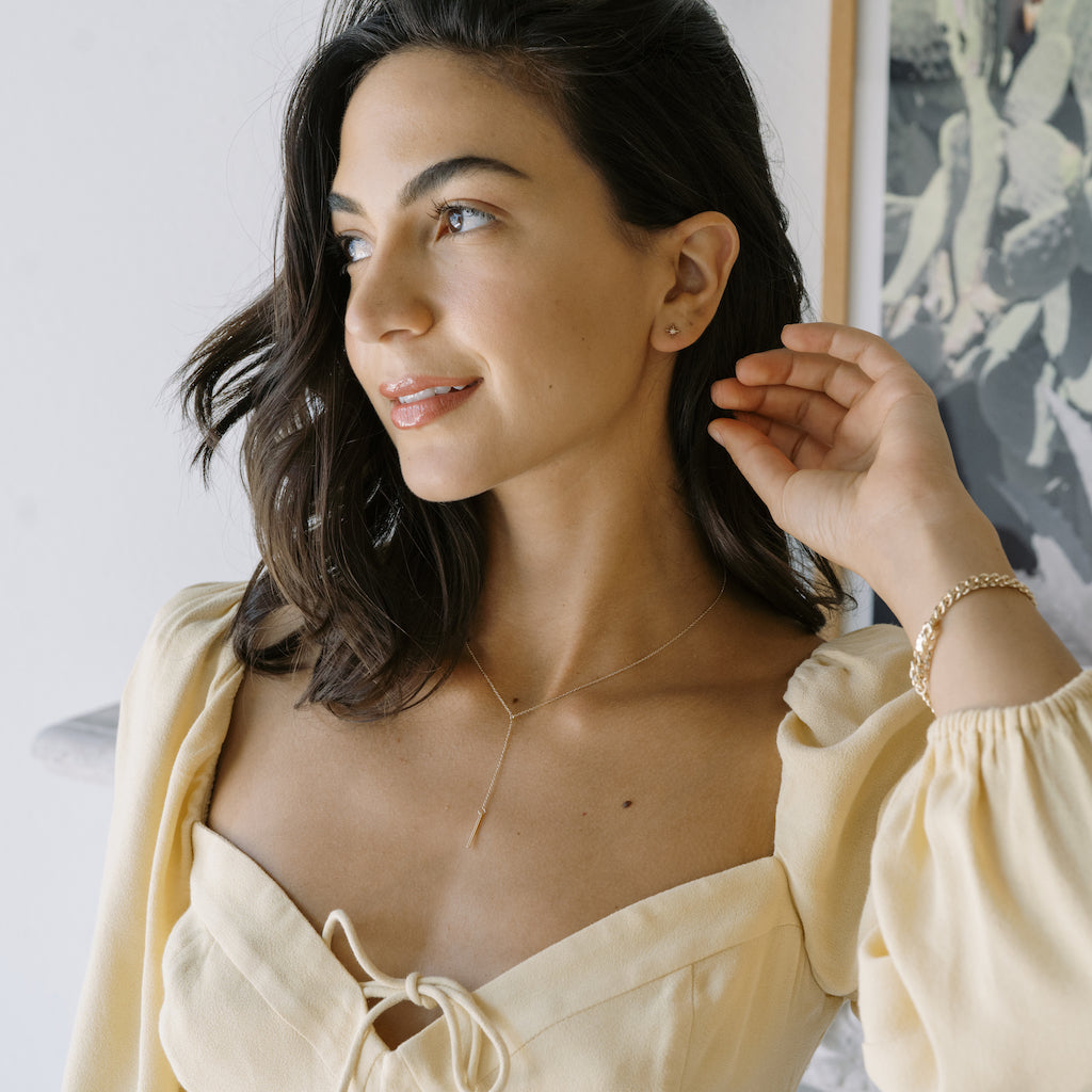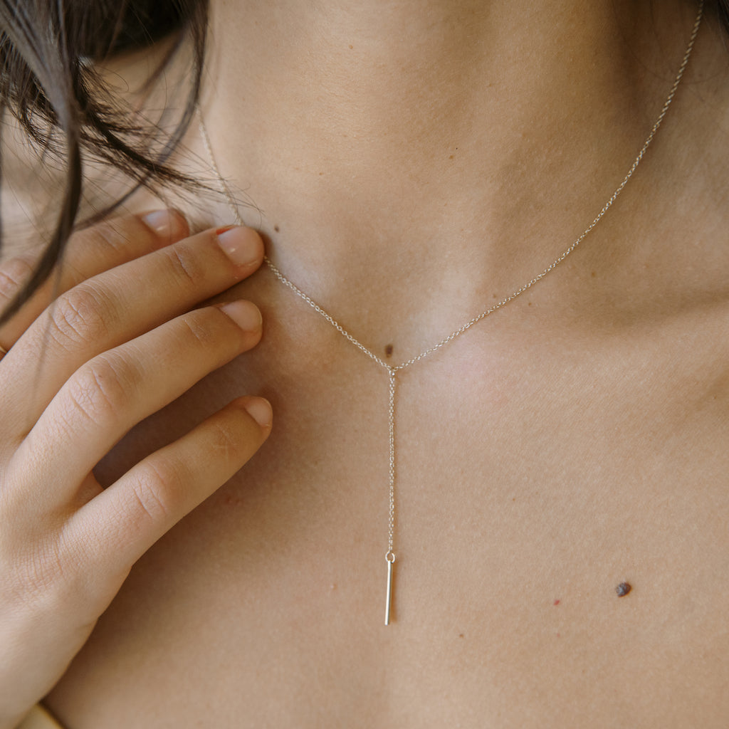 This whisper-thin lariat necklace features a delicate chain with a graceful drop, finished with a petite vertical bar for just the right touch of shine. Elegant on its own or layered with your favorite pieces, it adds subtle movement and polish to any look.