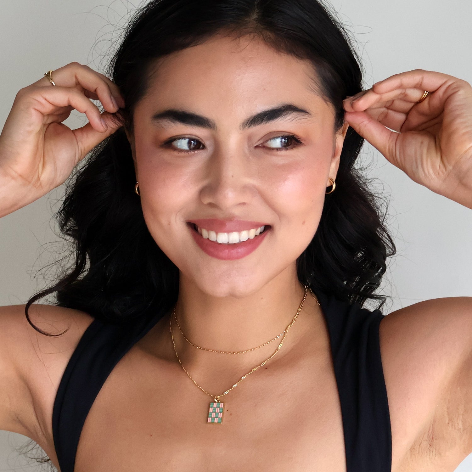 Our Checkmate Pendant features a playful checkered motif of matcha green and strawberry pink hues that make for a dopamine inducing subtle pop of color. The pendant is hung upon our sumptuous Singapore Twist Chain which makes this gorgeous worn solo or as the perfect layering companion.