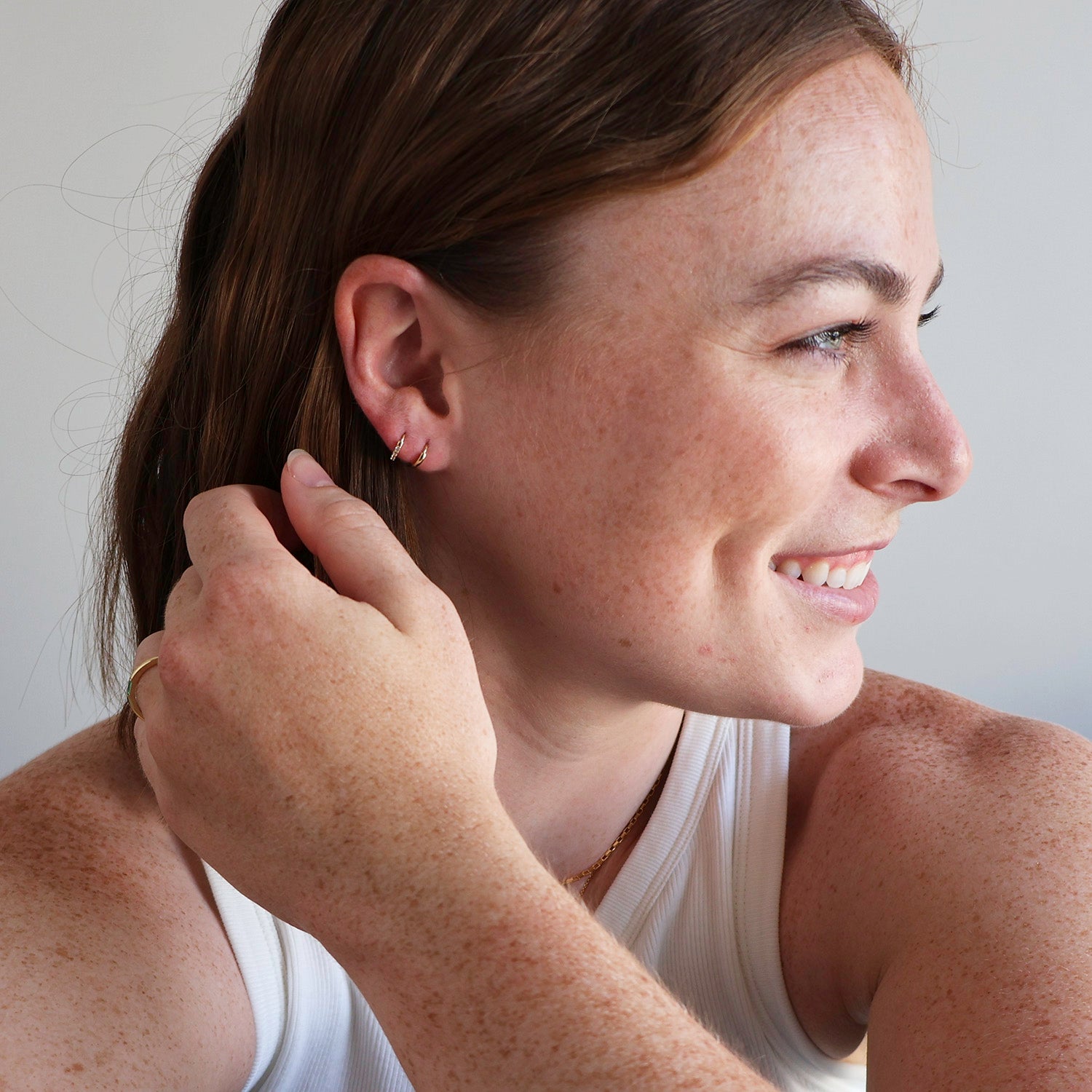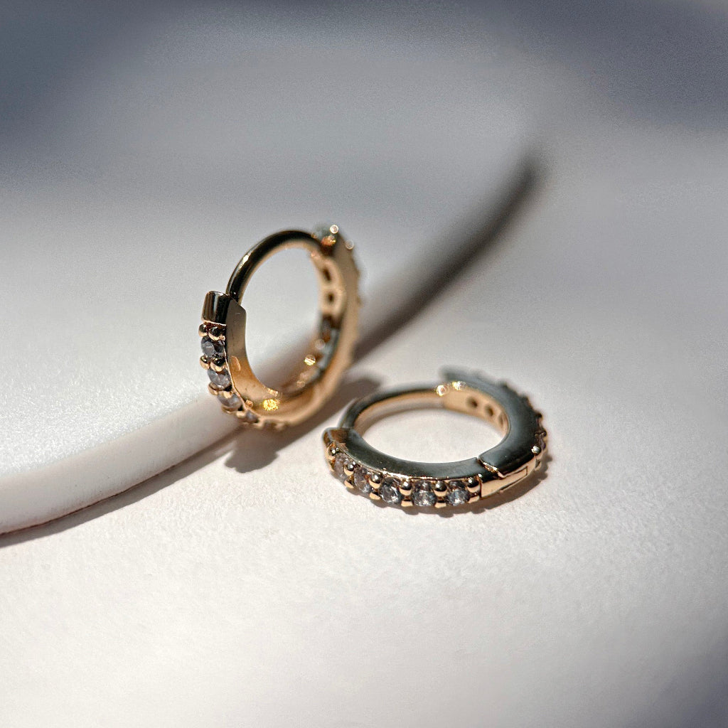 Our Crystal Baby Huggies are tiny but mighty. They are designed to hug your ears just right and lend the perfect amount sparkle. A staple for any ear stack, they shine solo or layered alongside your favorites.