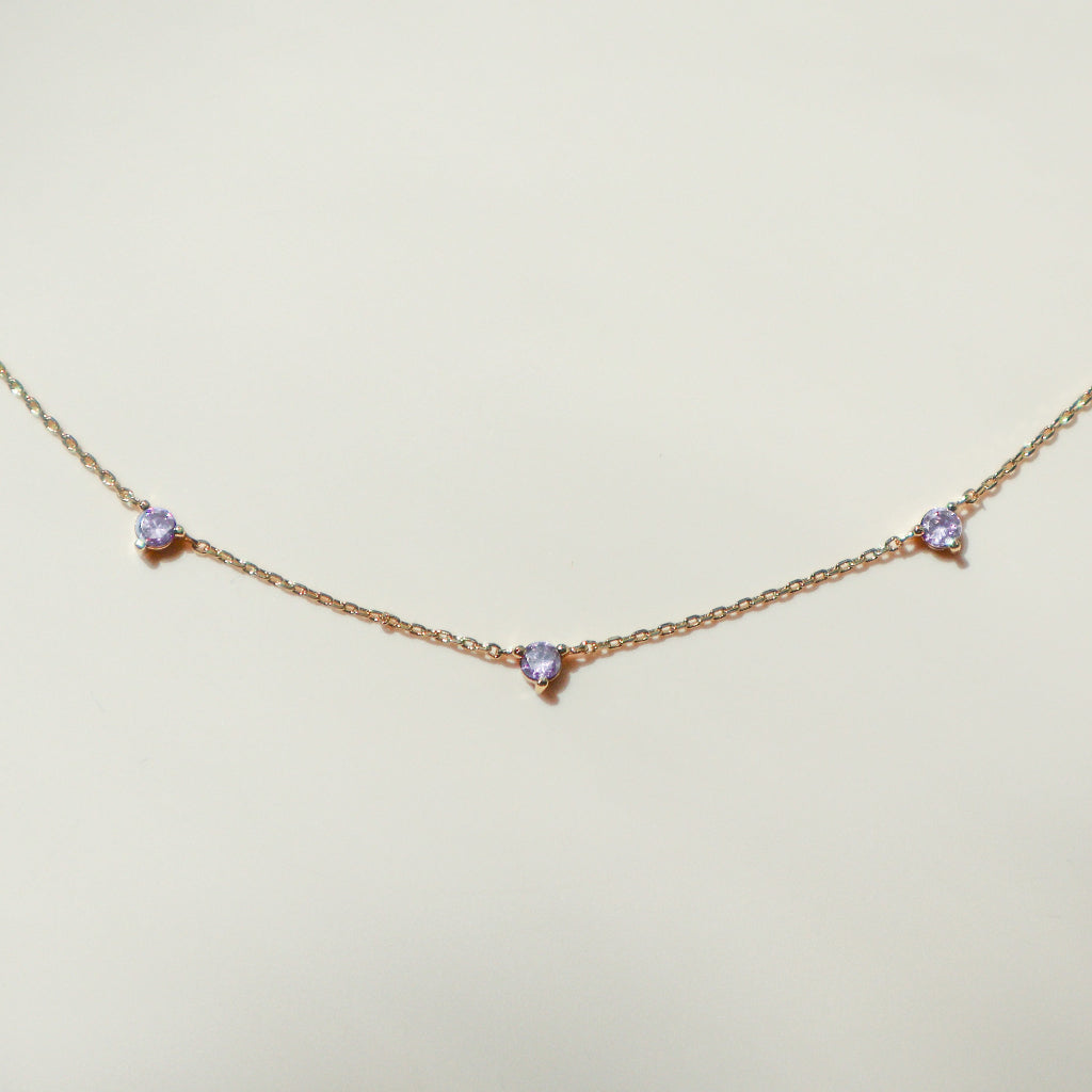 Three petite lilac crystals sit at the center of a whisper thin chain. Subtle and feminine, it’s an easy piece to wear every day - whether on its own for a hint of color or layered with your favorite necklaces.