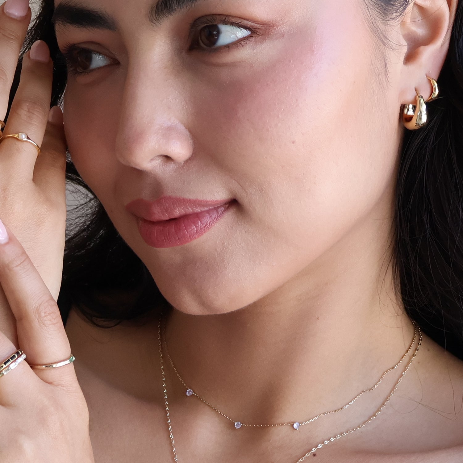 Necklaces, bracelets, and earrings are plated with 18k gold, 18k rose gold, or rhodium and finished with a protective coating.