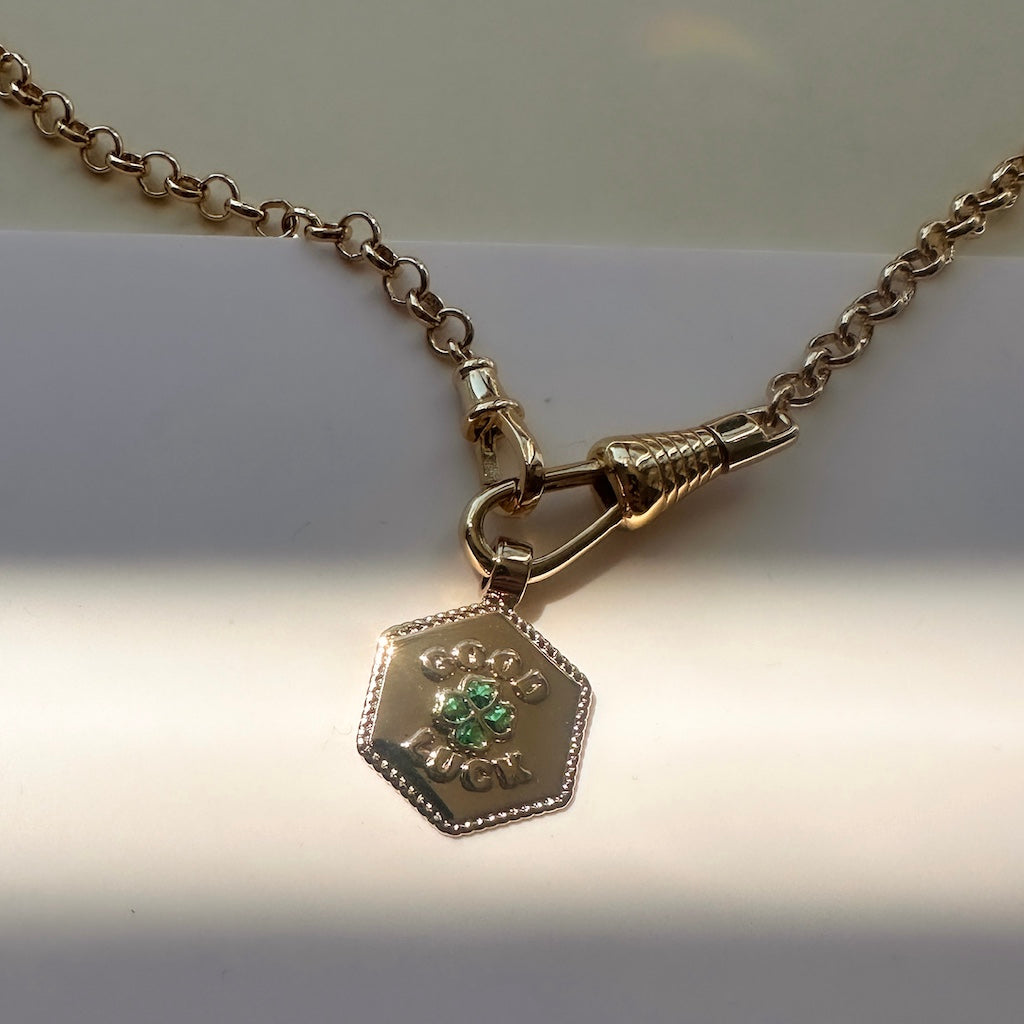 Our Good Luck Necklace brings a little charm to your day with a front clasp that says GOOD LUCK and a tiny green crystal clover for a pop of luck and color. Add your favorite charms to the connector to make it uniquely yours. A front-clasp chain with a sleek pushgate you can clip higher on the links for an instant lariat. Wear it classic, Y-shaped, or charm-stacked