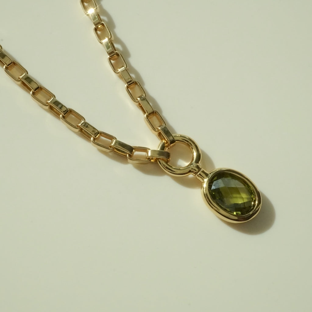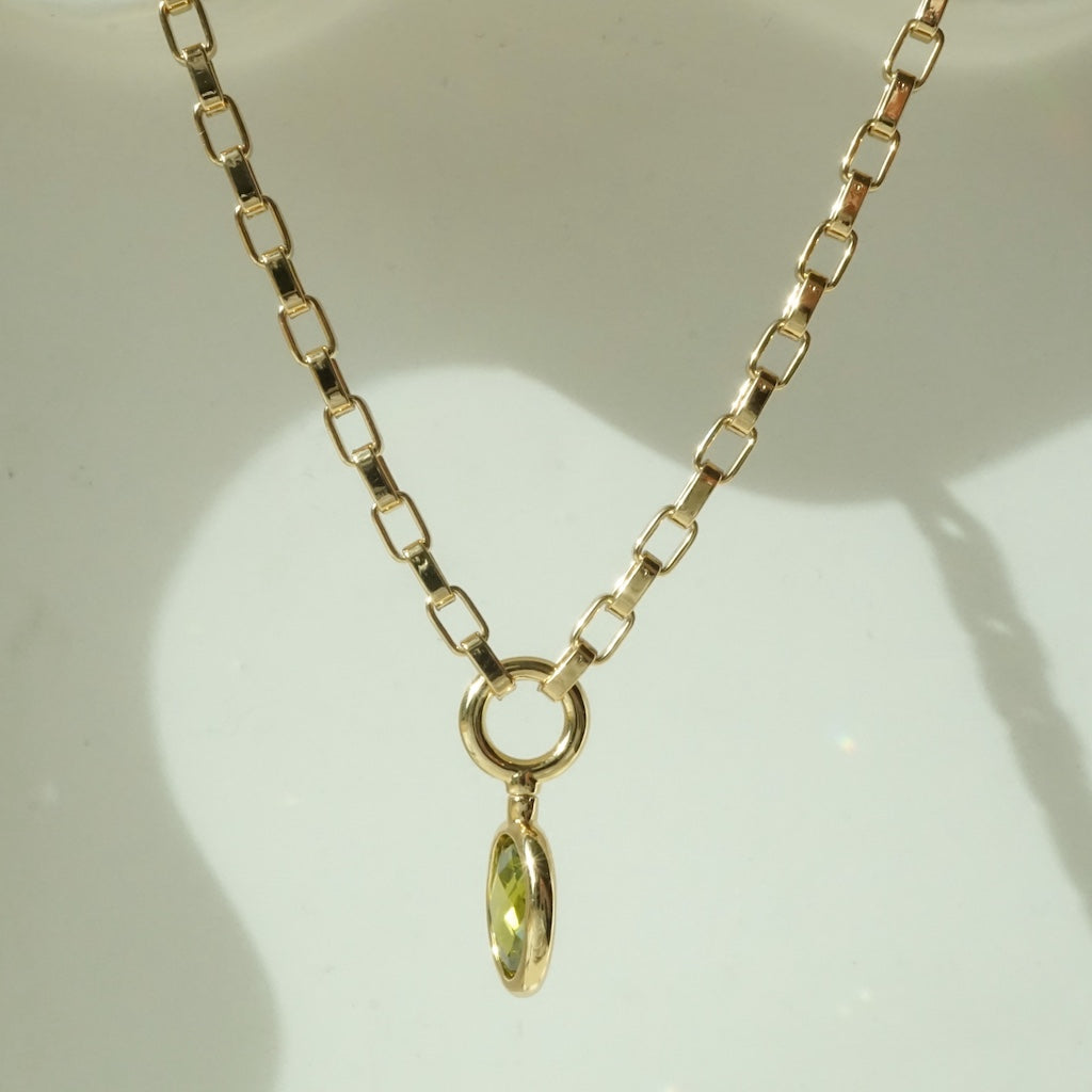 Our Halo Necklace features a smoothly spinning olive green crystal pendant hanging on a stylish box chain. Easy to wear and the kind of necklace that effortlessly pulls a look together. Spin the pendant for quiet, satisfying fidgeting. Perfect for zoning out, staying focused, or just keeping your hands busy.