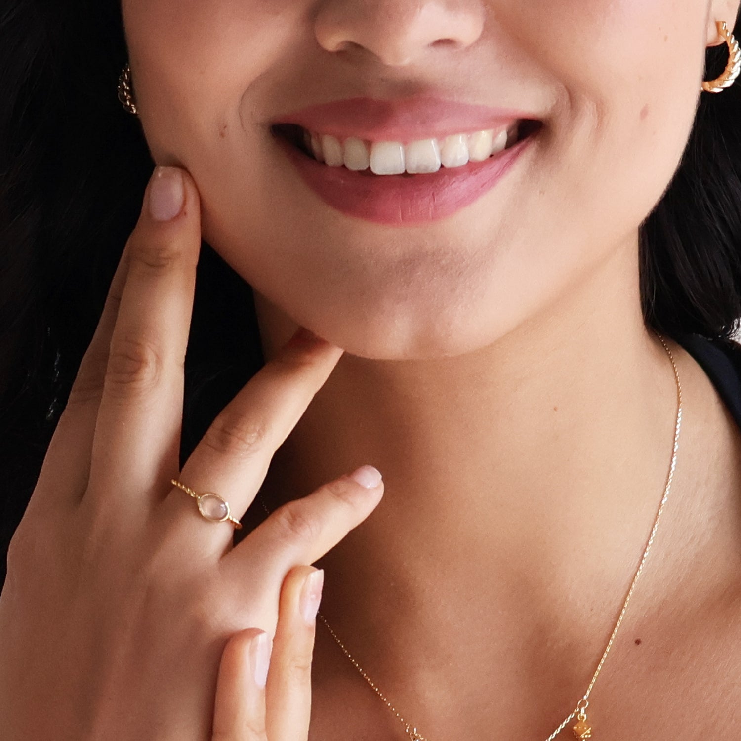 This dainty ring features a little oval magical natural labradorite stone - famous for its dreamy, color‑shifting glow - set in a delicate bezel atop a twisted, glimmering band. The labradorite catches the light with every flick of your hand, making it the perfect piece to wear solo or stack with your favorite rings.