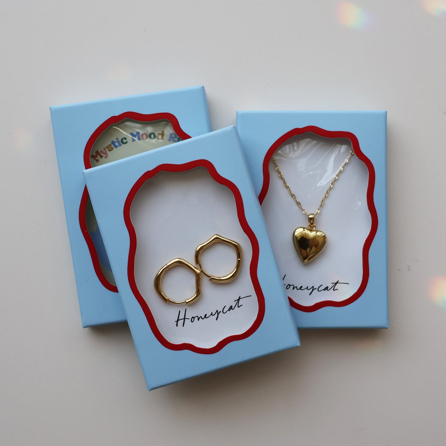 Complimentary envelope style gift box with a cut-out squiggle window style with blue & red artwork.